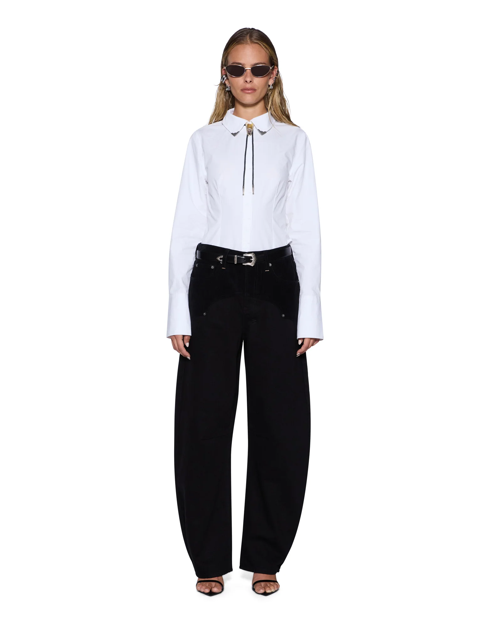 The Dare Open Back Long Sleeve Shirt White is a slim-fit shirt crafted from crisp white cotton poplin, designed with an open back and adjustable strap detailing. The style features an exposed Ksubi chain across the back neck, a concealed button placket with an exposed T-box snap at the top button, extended cuffs with exposed T-box snaps, a curved hem, tailored seams for a structured fit, and signature T-box embroidery.