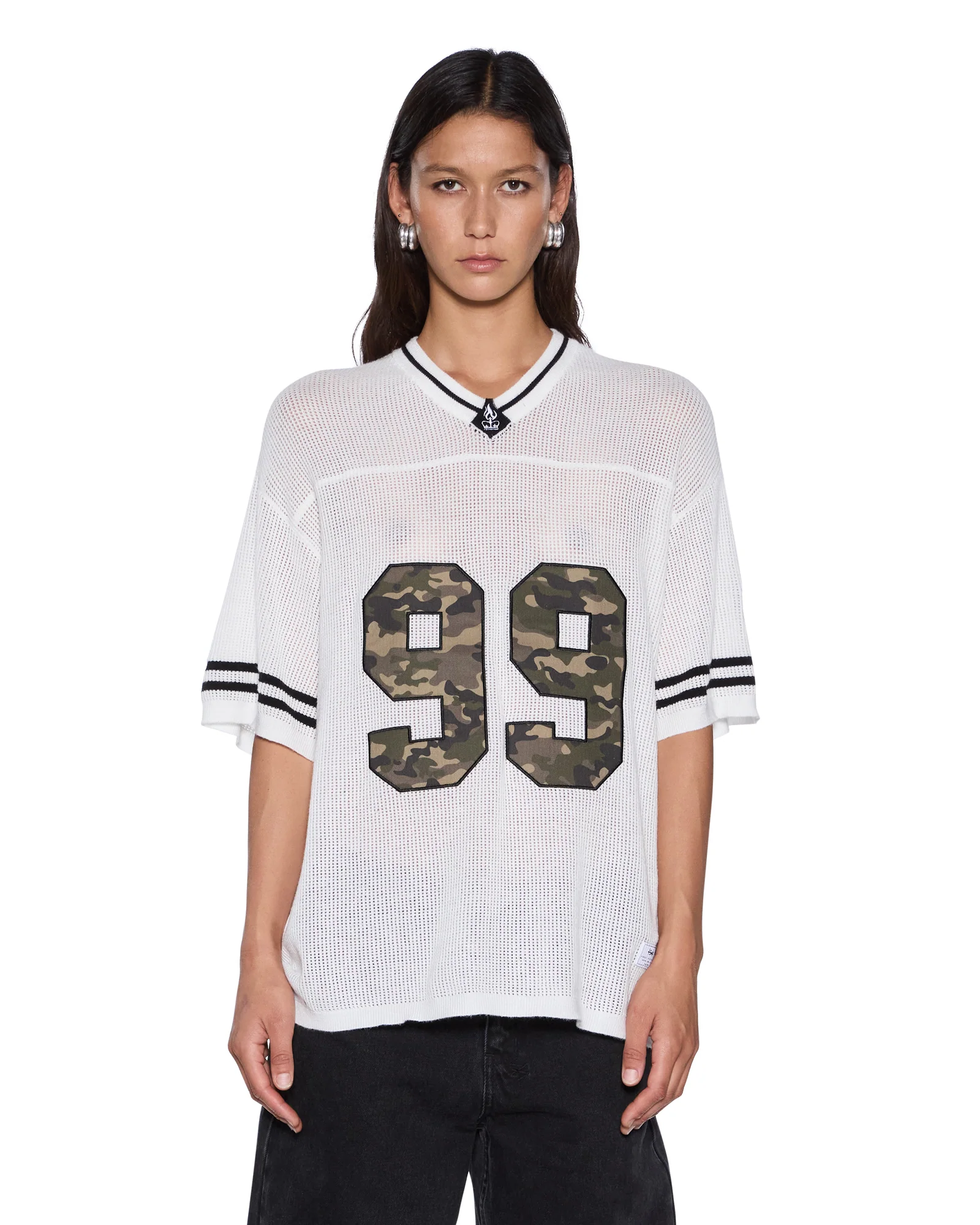 The Derby Boyfriend SS Jersey Camo Shell is an oversized short-sleeve jersey knit with a sporty edge. Made from a premium cotton-blend open-hole knit for lightweight breathability, it features contrast taping at the sleeve hems and neckband, varsity-inspired camo artwork on the front, a crest graphic on the sleeve, and signature Ksubi T-box embroidery.