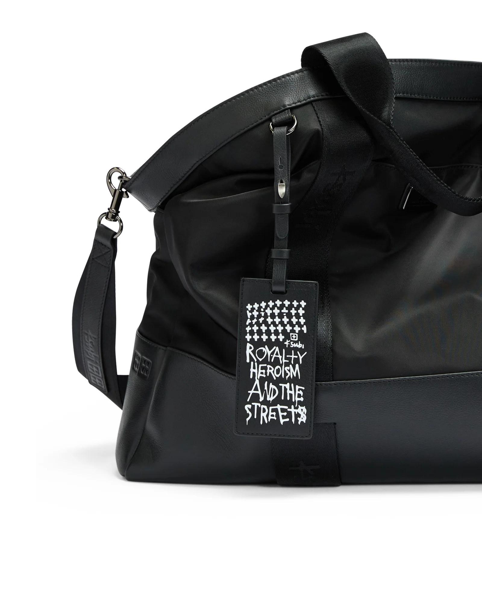 The Overnight Bag Nylon Leather is a durable duffle bag with iconic Ksubi details. Crafted from nylon and pebble leather, it features embossed 4x4 and Cross Box logos, a custom front Ksubi plate, and a bold flag travel tag. Functional design elements include side pockets, a front sleeve pocket, and a top metallic zip for secure closure.